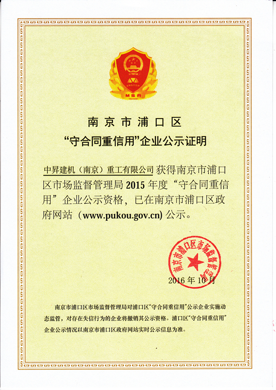 2016年10月,我公司獲得南京市浦口區(qū)市場(chǎng)監(jiān)督管理局2015年度“守合同重信用”企業(yè)公示資格,已在南京市浦口區(qū)政府網(wǎng)站(www.pukou.gov.cn)公示。