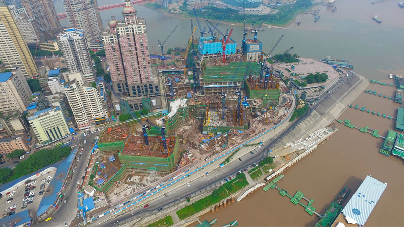 重慶來福士廣場的8座塔樓,2座施工高度220m,4座施工高度248m,2座施工高度348m,采用中昇建機ZSL1700(80T)一臺,ZSL1500(64T)一臺,ZSL1000(64T)一臺,ZSL750(50T)四臺,ZSL500(32T)六臺,ZSL380(32T)六臺。