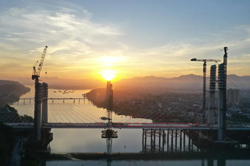 該工程采用由我公司生產(chǎn)研發(fā)的兩臺(tái)ZSC2200、一臺(tái)ZSL2700塔機(jī)完成吊裝任務(wù)。其中,富春江大橋?yàn)槿€控制性工程,為國內(nèi)首座設(shè)計(jì)時(shí)速350公里的4線無砟軌道高低塔斜拉橋,全長535米,主跨300米,設(shè)計(jì)為混合梁斜拉橋,采用高、低塔非對稱邊跨布置。主墩索塔設(shè)計(jì)均為“H型”橋塔,主梁采用鋼混組合結(jié)構(gòu)。