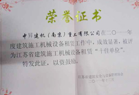 熱烈祝賀中昇建機(南京)重工有限公司被評為江蘇省建筑施工機械設(shè)備租賃“十佳單位”! 2010-12-16 |