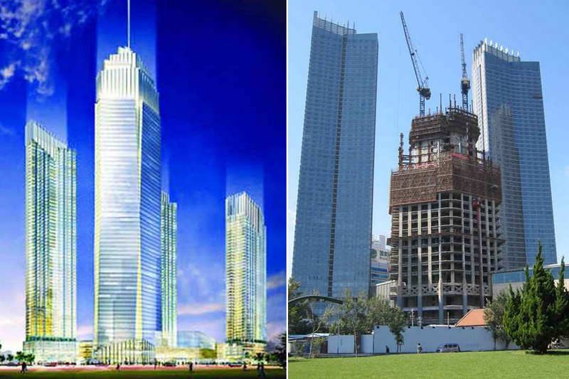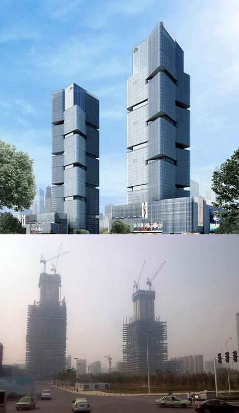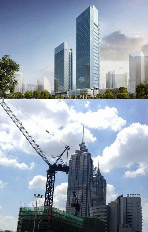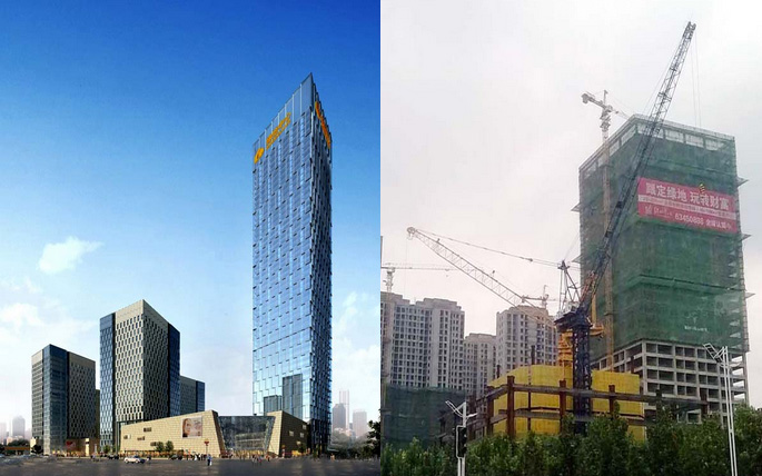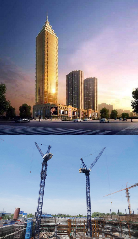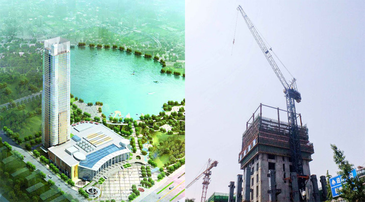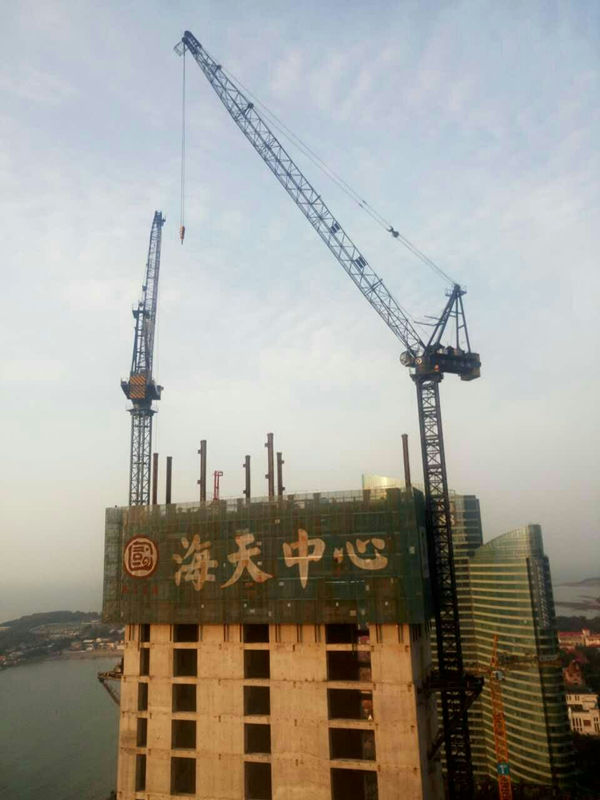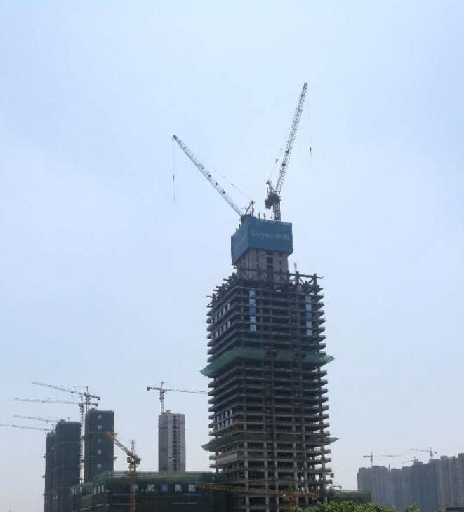 大樓高度208米,采用中昇建機(jī)ZSL1000一臺(最大吊重64t)和ZSL750一臺(最大吊重50t)。