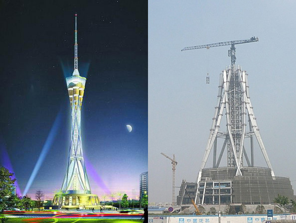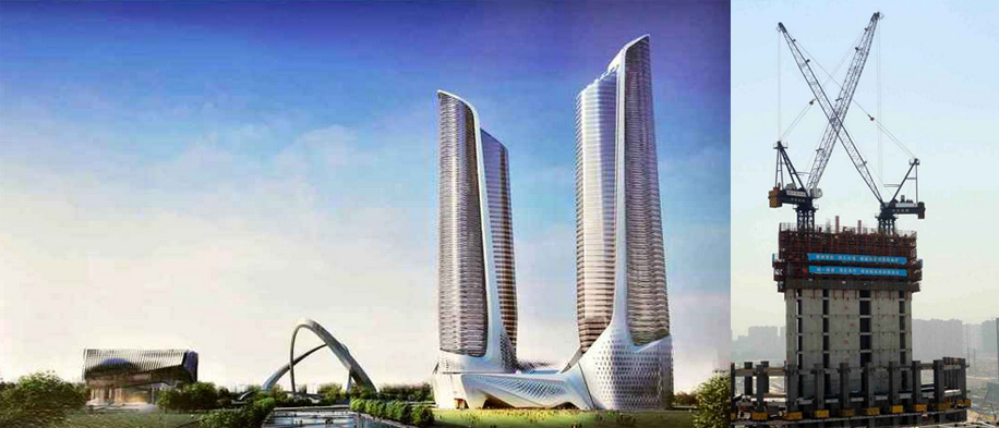施工高度326.6米,采用中昇建機(jī)一臺ZSL1000(最大吊重64t) 和一臺ZSL380(最大吊重32t)