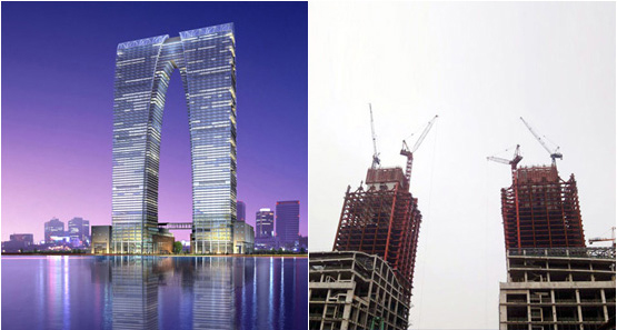 建筑高度380米,采用中昇建機(jī)ZSL1250(64T)兩臺,ZSL750(50T)一臺。