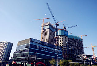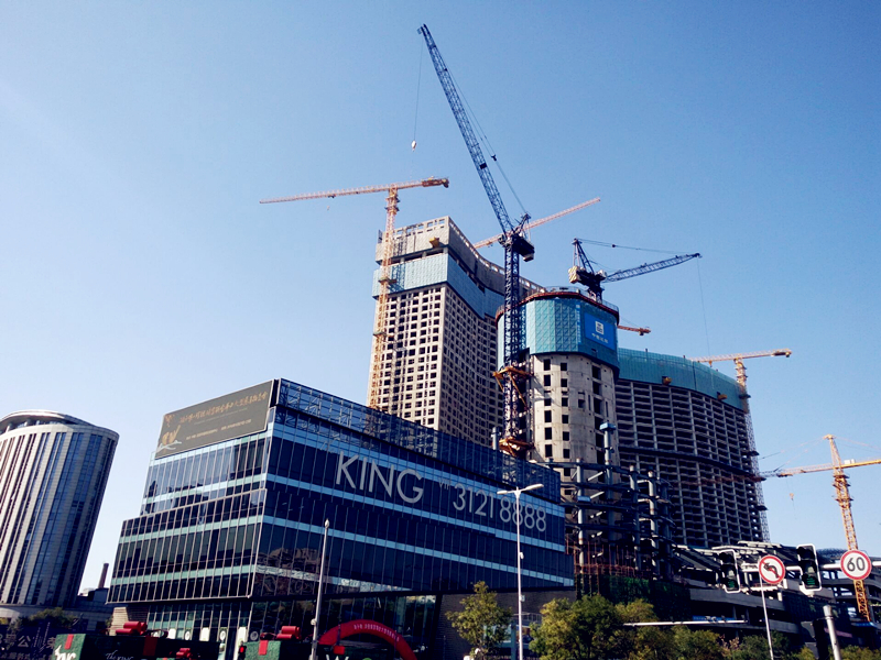建筑主體高度438米,采用中昇建機(jī)ZSL1250(64T)及ZSL380(32T)各一臺(tái)。