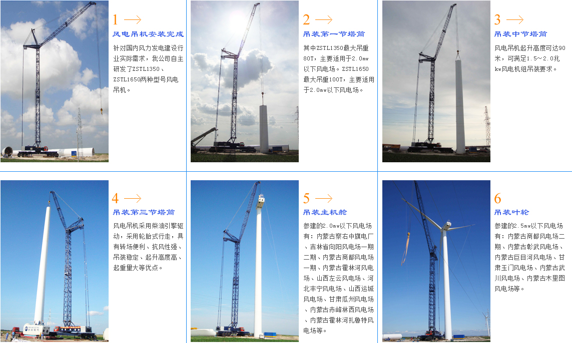 我公司自主研發(fā)了ZSTL1350、ZSTL1650兩種型號風(fēng)電吊機,其中ZSTL1350最大吊重80T,主要適用于2.0mw以下風(fēng)電場。ZSTL1650最大吊重100T,主要適用于2.0mw以下風(fēng)電場。